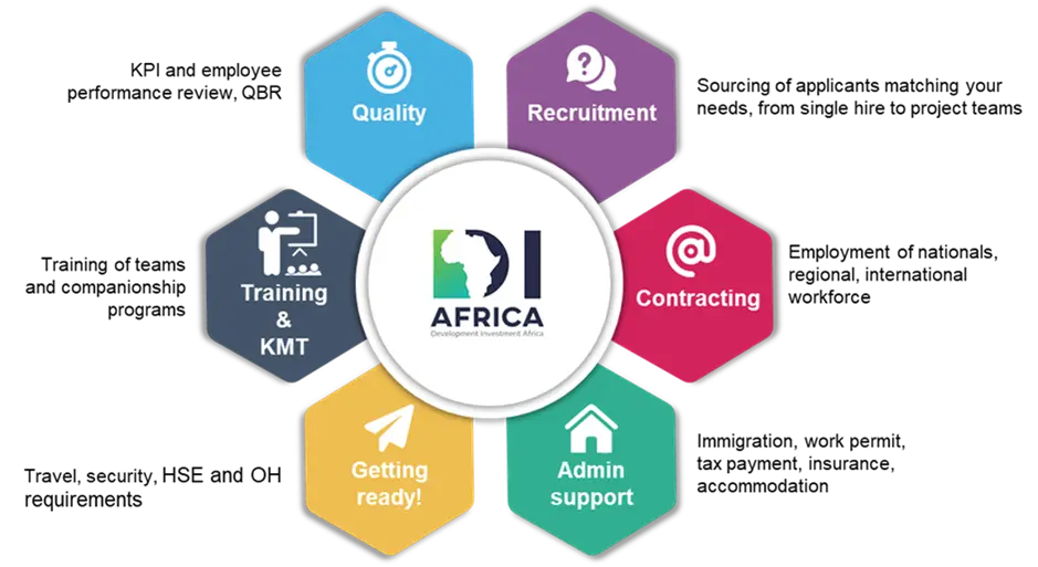 En outre, DI-Africa se spécialise dans l'élaboration de solutions en ressources humaines sur mesure, conçues spécifiquement pour répondre à vos besoins uniques et vous aider à atteindre vos objectifs commerciaux avec efficacité et professionnalisme. Nous comprenons l'importance de chaque contrat commercial et nous nous efforçons de vous accompagner à chaque étape de votre projet.